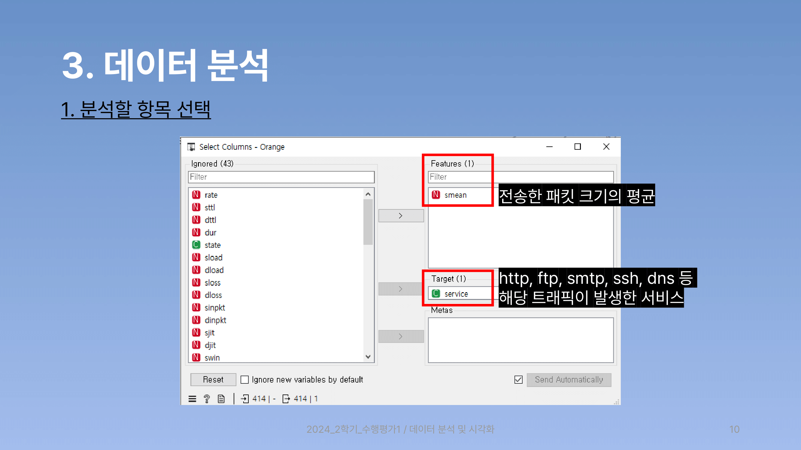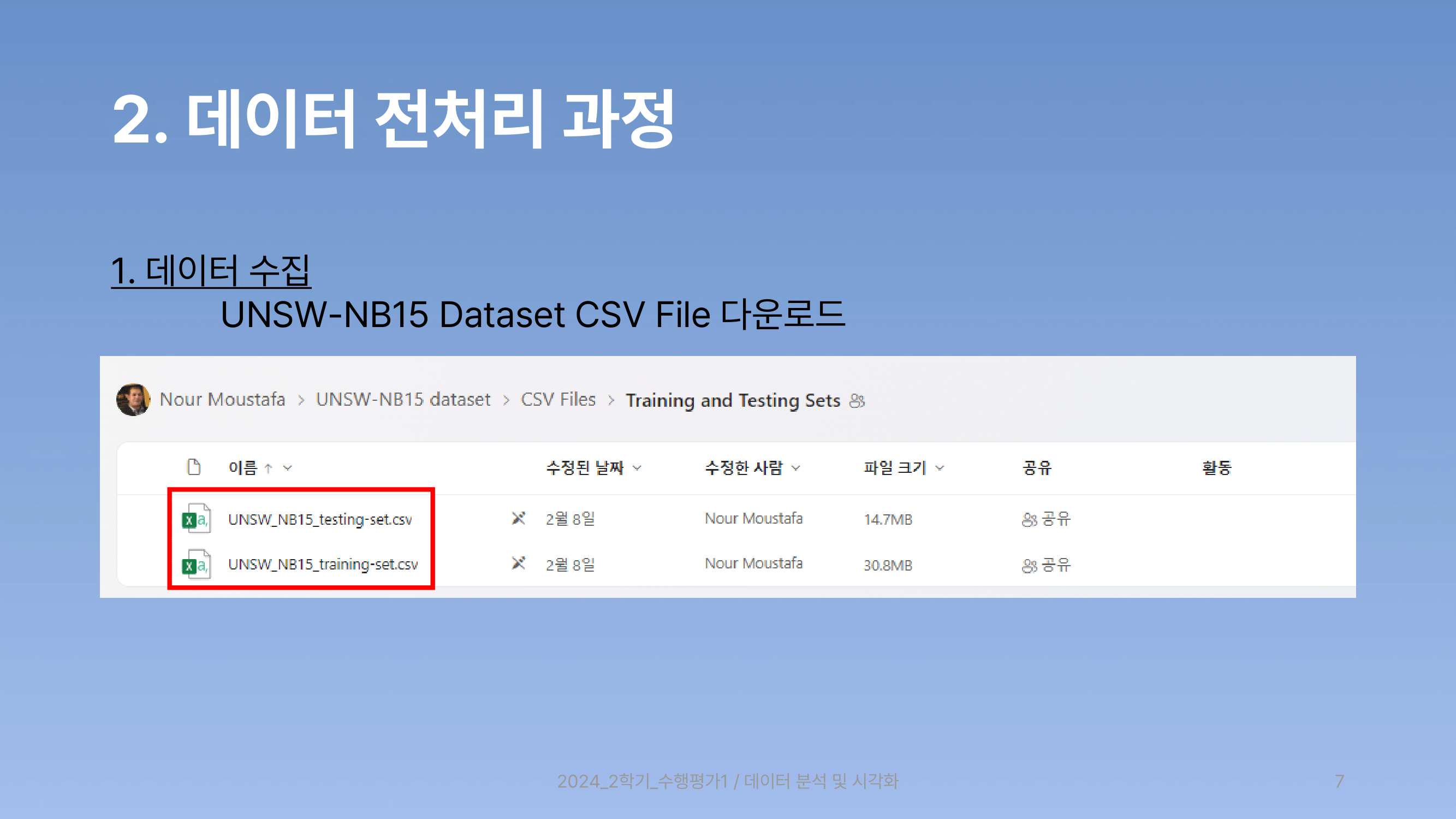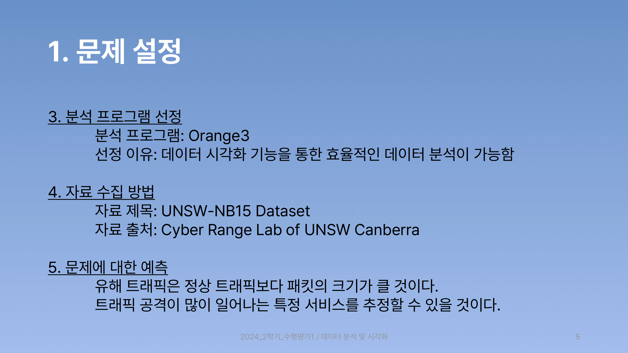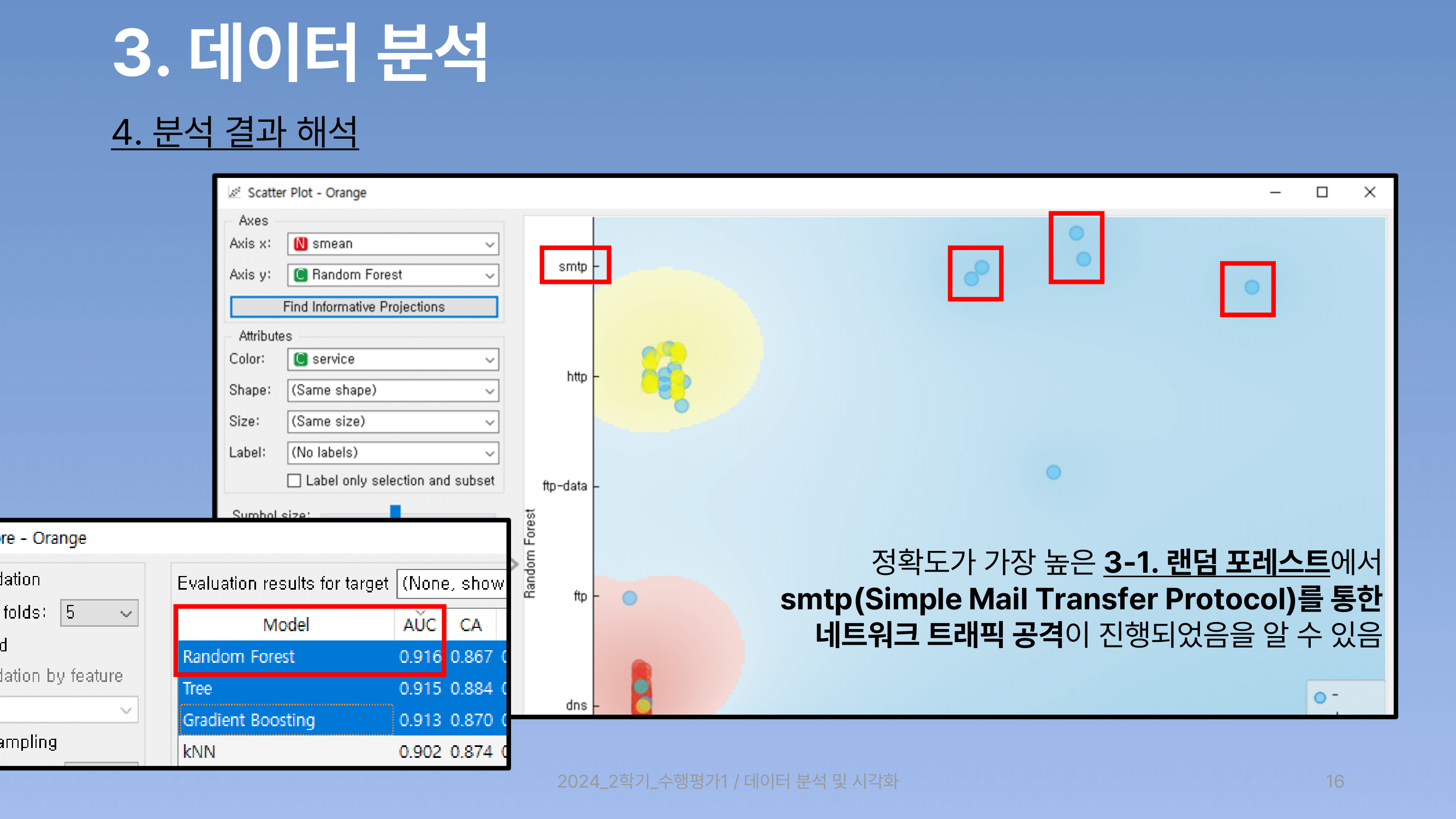 μΈ UNSW-NB15λ₯Ό μ ν μ°κ΅¬ μ°Έκ³ ν΄ Orange3λ₯Ό ν΅ν΄ μκ°νμ μ±κ³΅νκ³ , μ΄λ₯Ό κΈ°λ°μΌλ‘ κ³ μ°°κ³Ό μ μΈμ λνμ΅λλ€.
